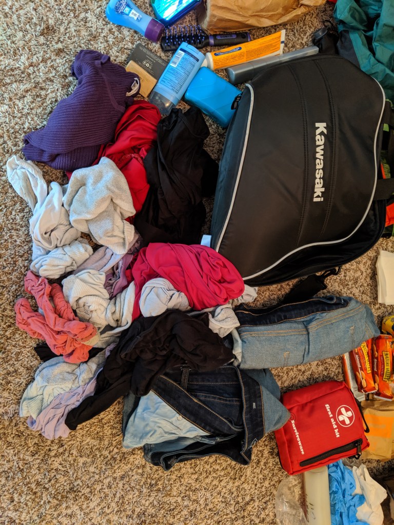 Tank bag: medication, lip balm, kindle, extra hair ties, sun glasses, USB batterie, cables, headset, change