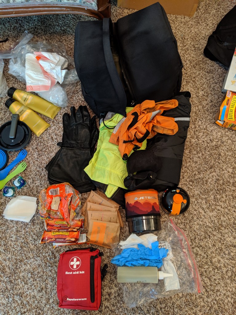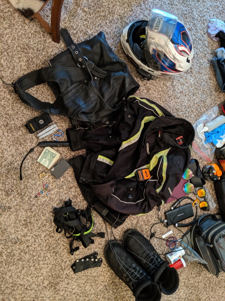 Worn items: boots, jacket, chaps, helmet, hair glove, wallet, cash, ring, necklace, flashlight, Leatherman. There’s also an extra pair of ROK straps here. The SPOT unit is attached to the jacket.