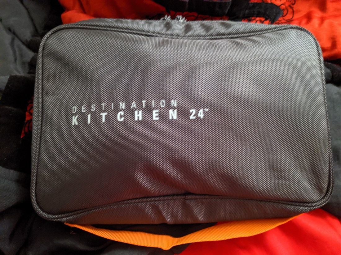 Cutting board (with identifying marks on each side,) wash cloth, two condiment bottles (with solid and spout caps,) scrubber, knife with blade sheath, microplane grater, whisk, serving spoon, spatula, small version of the Spice Rocket, and 4 each knives, spoons and forks which are good ones.