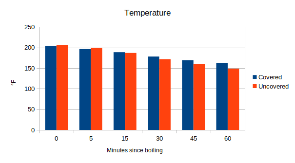 Covered lost about 42 degrees while uncovered lost 57. The uncovered higher 0 minute temperature and roughly 1 degree lower heat loss at 5 minutes is likely due to the teapot being at a much higher starting temperature.