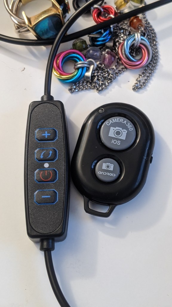 The remote switch next to it has nothing to do with the light’s function. It’s a Bluetooth shutter release you can use with your phone. Pairing was trivial for me. The device name was “AB Shutter3.” There’s a sliding power switch on the right side, a blue LED at the left top, and the two buttons. The LED flashes several times when it’s turned on and once whenever a button is pressed. It takes one CR 2032 lithium coin battery which is not included.